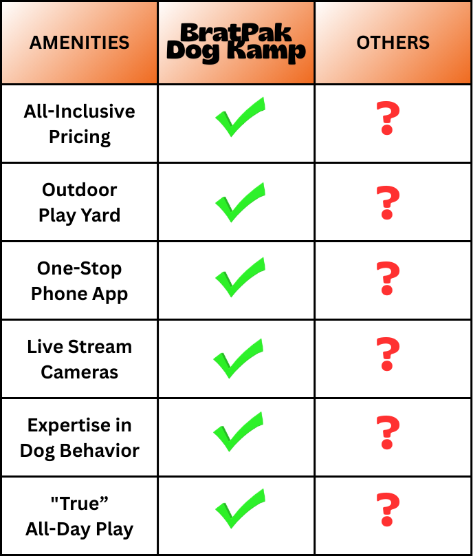BratPak offers all-day, cage-free play for every dog, so all dogs must pass a behavioral assessment (New Kamper Orientation).